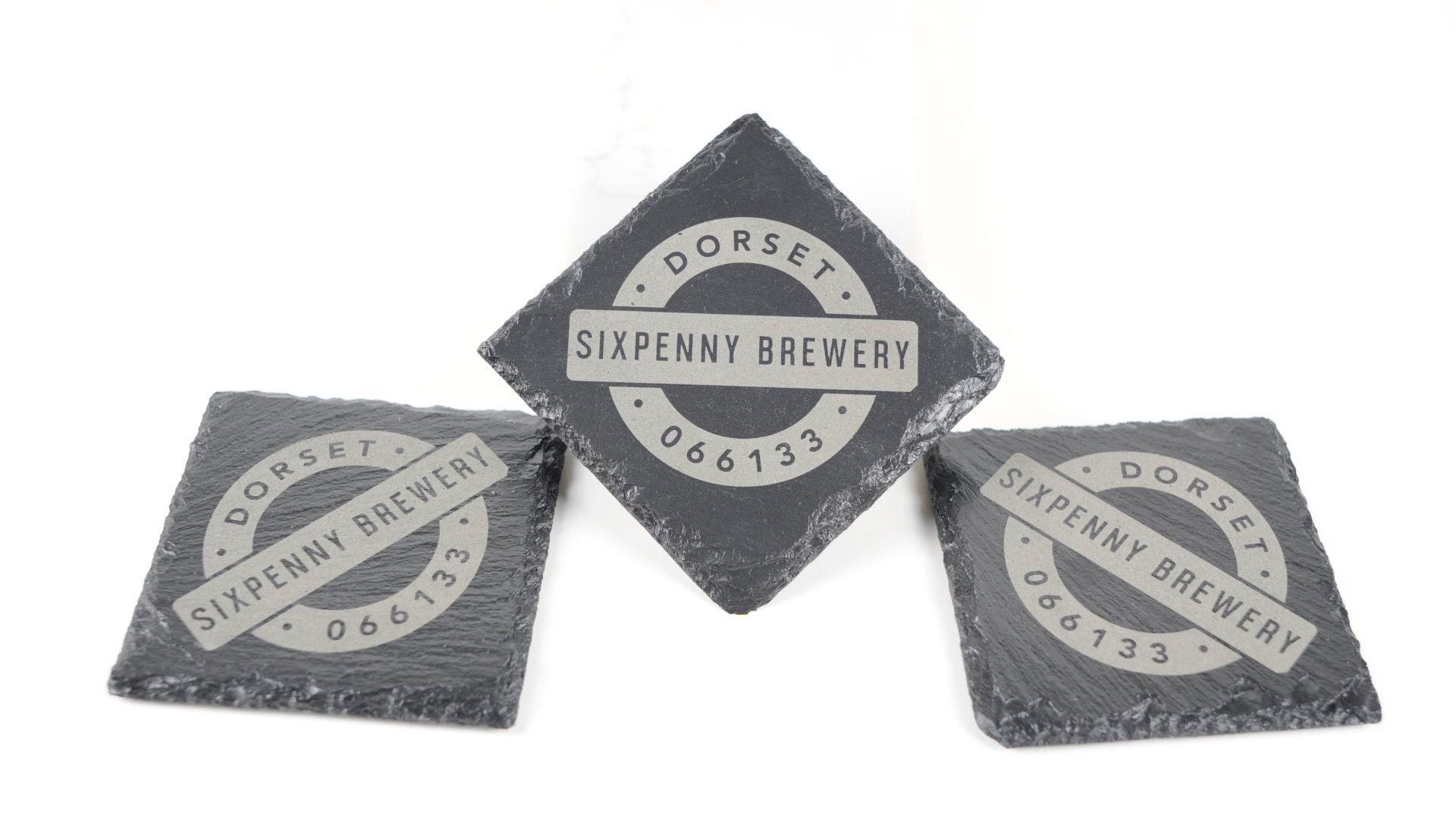 Laser-engraved natural slate coasters featuring the classic Sixpenny Brewery logo. permanently etched into the surface for a crisp, timeless finish.